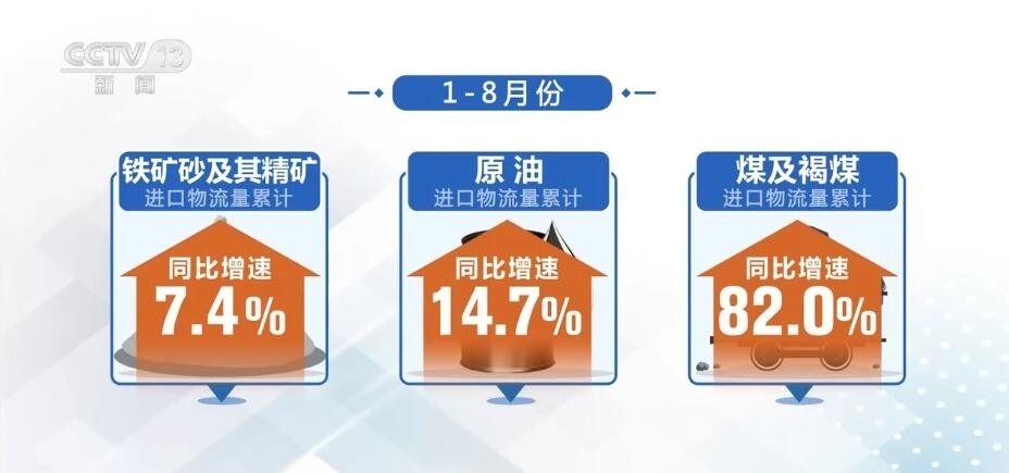 從進(jìn)口來看,隨著內(nèi)需改善,進(jìn)口物流也呈現(xiàn)量價(jià)回升。1—8月份進(jìn)口物流總額同比增長14.4%,增速持續(xù)回升。從產(chǎn)品結(jié)構(gòu)看,原材料等大宗商品進(jìn)口增速有所加快,鐵礦砂及其精礦、原油、煤及褐煤進(jìn)口物流量累計(jì)同比增速分別為7.4%、14.7%、82.0%。