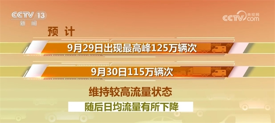 預(yù)計(jì)假期第一天,也就是今天(9月29日)出現(xiàn)最高峰125萬(wàn)輛次,明天115萬(wàn)輛次,維持較高流量狀態(tài),隨后日均流量有所下降。假期第七日和第八日路網(wǎng)流量將再度上升,且下午16時(shí)至19時(shí)易出現(xiàn)返程車(chē)流高峰。