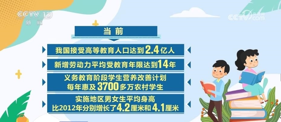 當(dāng)前,我國接受高等教育人口達(dá)到2.4億人,新增勞動力平均受教育年限達(dá)到14年。義務(wù)教育階段學(xué)生營養(yǎng)改善計劃每年惠及3700多萬農(nóng)村學(xué)生,實施地區(qū)男女生平均身高比2012年分別增長了4.2厘米和4.1厘米。