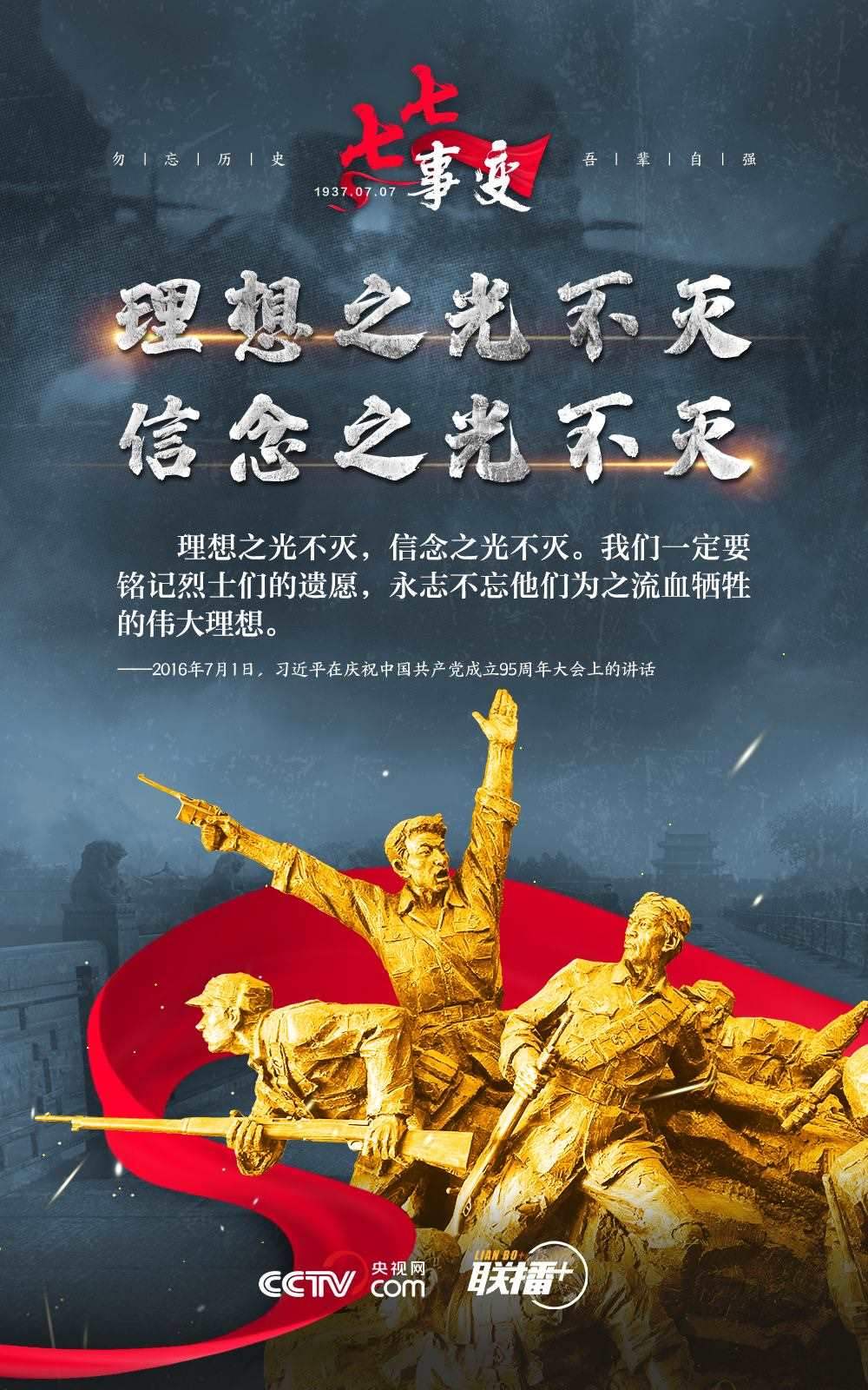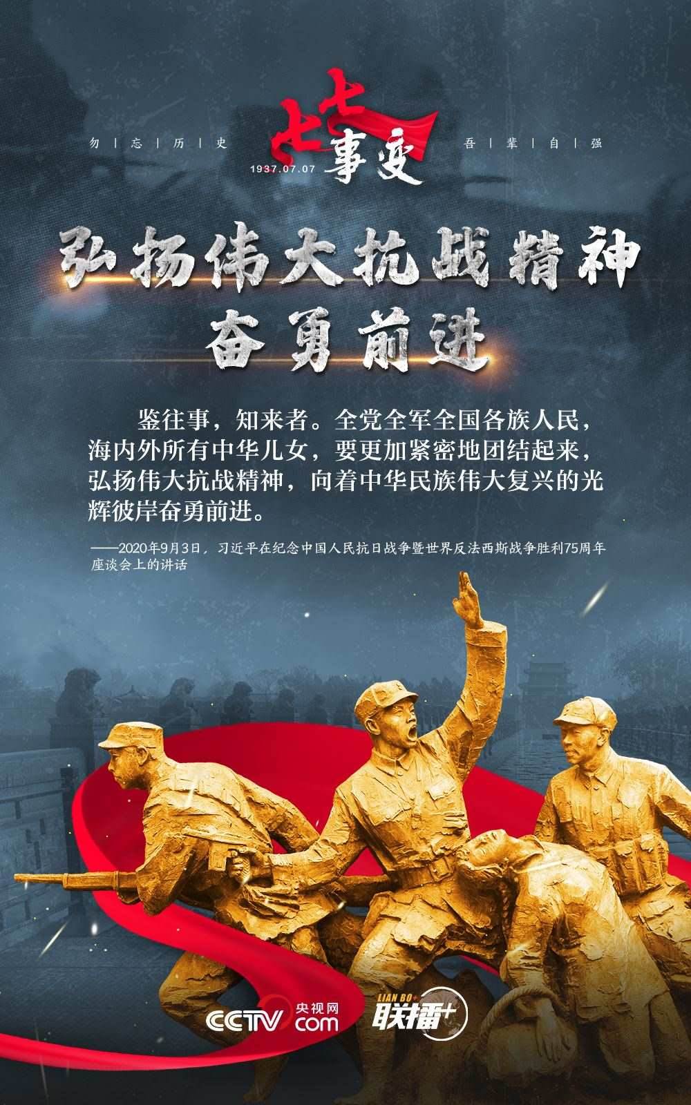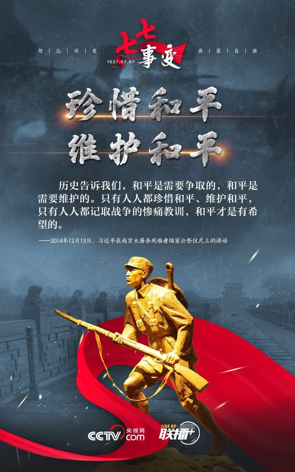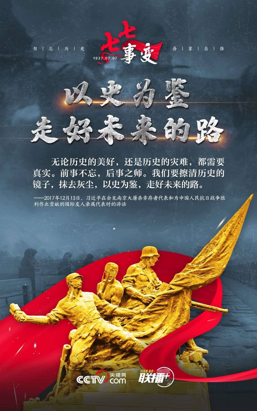 悼念同胞,緬懷先烈。勿忘歷史,吾輩自強!在“七七事變”86周年之際,央視網(wǎng)《聯(lián)播+》欄目特推出海報,與您一起從總書記講話中汲取自強不息的奮進力量。