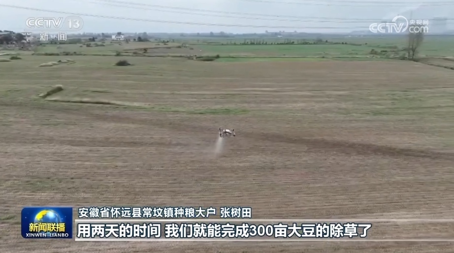 今年,皖北大豆主產(chǎn)區(qū)持續(xù)推進(jìn)單產(chǎn)提升行動(dòng)。在安徽懷遠(yuǎn)縣種糧大戶張樹(shù)田的300畝大豆田里,無(wú)人機(jī)、植保機(jī)正在除草。由于夏播時(shí)全部采用大豆根瘤菌拌種,豆苗出得更齊、更壯。