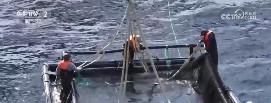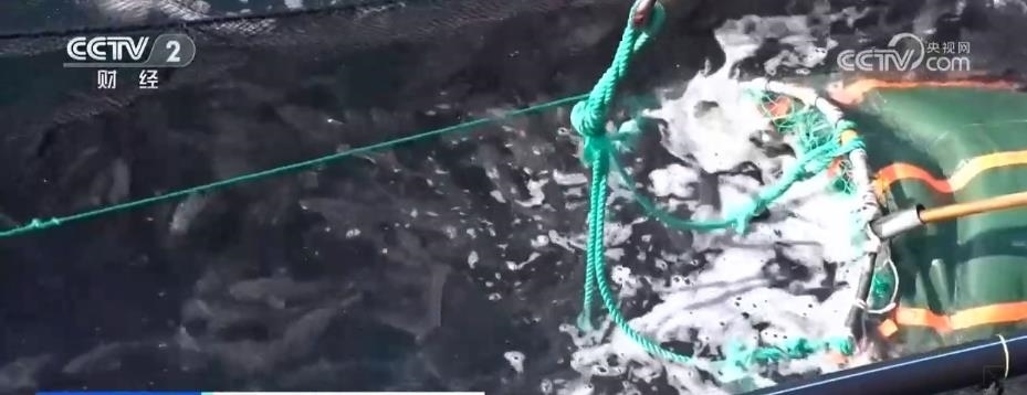 在煙臺(tái)長(zhǎng)島南隍城海域,隨著經(jīng)海系列深水網(wǎng)箱里魚(yú)類(lèi)的成熟,一場(chǎng)在大海上的收獲正在進(jìn)行。起降機(jī)將一個(gè)個(gè)裝滿魚(yú)兒的巨大網(wǎng)兜轉(zhuǎn)移到運(yùn)輸船上,2.5萬(wàn)尾近4萬(wàn)斤的成品黑鲪魚(yú),將從這里銷(xiāo)往全國(guó)各地。