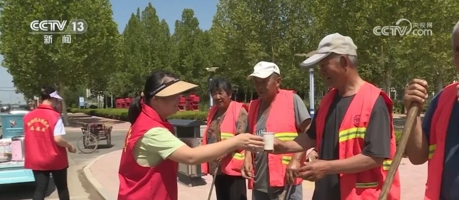 在德州市陵城區(qū),當(dāng)?shù)卦O(shè)置了歇腳驛站,為戶外工作者提供納涼的地方。同時,志愿者們走進(jìn)田間地頭、街頭巷尾,為戶外工作者們送去綠豆湯、礦泉水等解暑降溫物品。