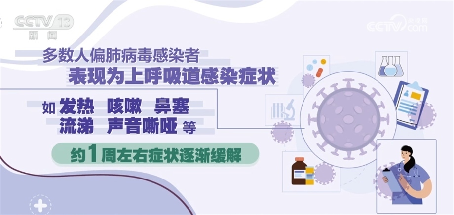 《人偏肺病毒感染診療方案(2023年版)》指出,人偏肺病毒感染者是主要傳染源。從潛伏期末到急性期都有傳染性。主要通過飛沫和密切接觸傳播,也可以通過接觸被病毒污染的物品間接傳播。人偏肺病毒人群普遍易感,在5歲以下兒童、老年人和免疫功能低下的人群中更為多見,潛伏期為3天—9天,多為3天—6天。多數人偏肺病毒感染者表現為上呼吸道感染癥狀,如發(fā)熱、咳嗽、鼻塞、流涕、聲音嘶啞等,約1周左右癥狀逐漸緩解。鑒于目前尚無證據證明有對人偏肺病毒有效的特異性抗病毒藥物,不建議使用抗病毒藥物進行治療。避免盲目或不恰當使用抗菌藥物,尤其是聯(lián)合使用廣譜抗菌藥物。