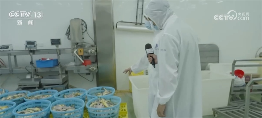 總臺央視記者 馬寧:我現(xiàn)在來到了寧德市當?shù)匾患冶容^大的黃魚生產(chǎn)企業(yè),大家可以看到我身后就是工人們正在把已經(jīng)腌制好的黃魚經(jīng)過分撿、稱重、打包、送進冷庫,這些經(jīng)過處理的大黃魚就可以通過冷鏈物流送到千家萬戶的餐桌上。