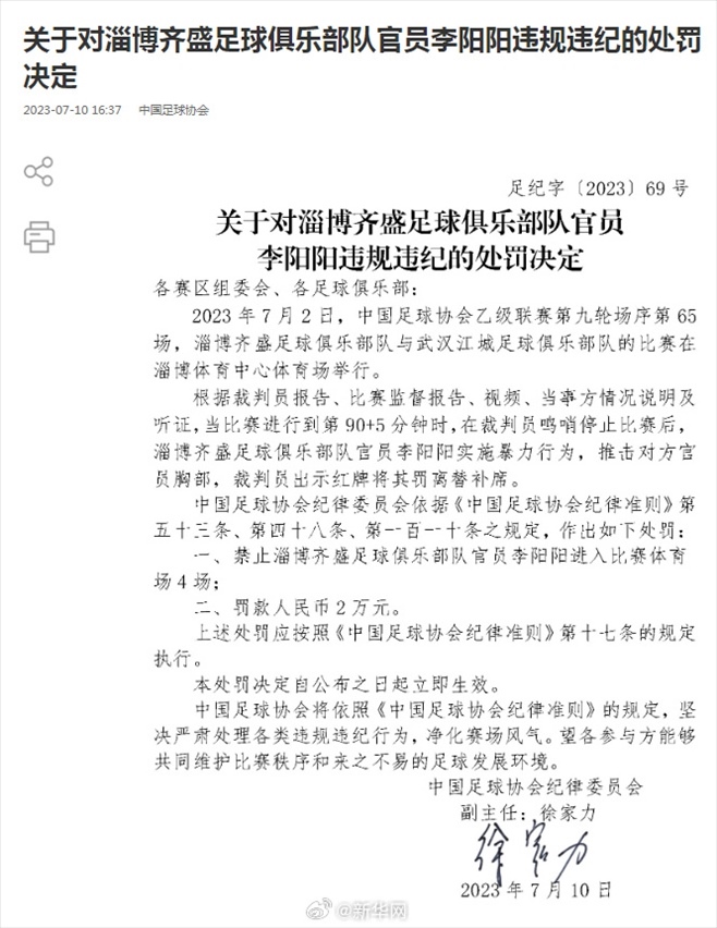 ·中國(guó)足協(xié)再開(kāi)罰單,兩名俱樂(lè)部官員因違規(guī)違紀(jì)被罰。