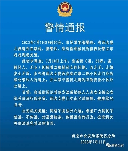 ·網(wǎng)傳“老人當(dāng)街遺棄雙胞胎女?huà)搿?,警方:系?fù)氣而為,已行拘。