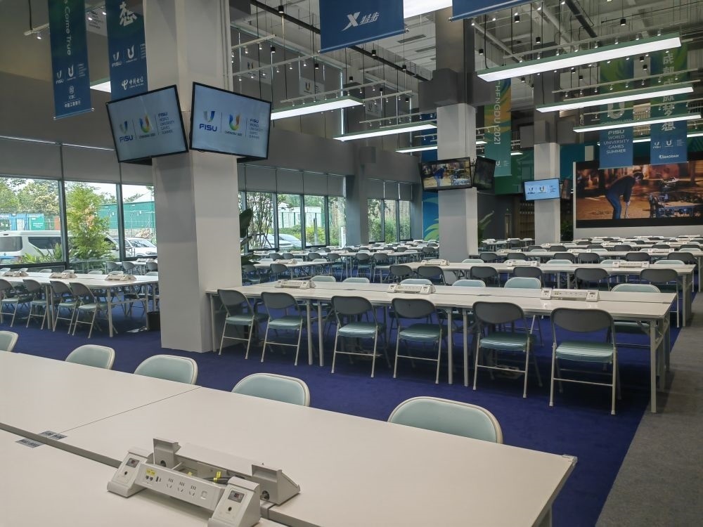 成都大運(yùn)會(huì)主媒體中心內(nèi)的媒體工作區(qū)。新華社記者董小紅攝