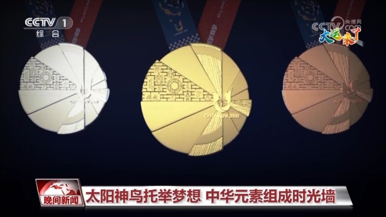 再來看圖案。獎牌正面設(shè)計賦予“太陽神鳥”羽翼幾何感,與賽會會徽“U”呼應(yīng),猶如神鳥,振翅欲飛,寓意守護夢想,自信昂揚,飛往多彩未來。同時,在幾何扇面嵌入一塊包含多種中華文明代表元素為底紋的絢麗時光墻,以呈現(xiàn)中國五千年文明的璀璨輝煌和演變歷史。