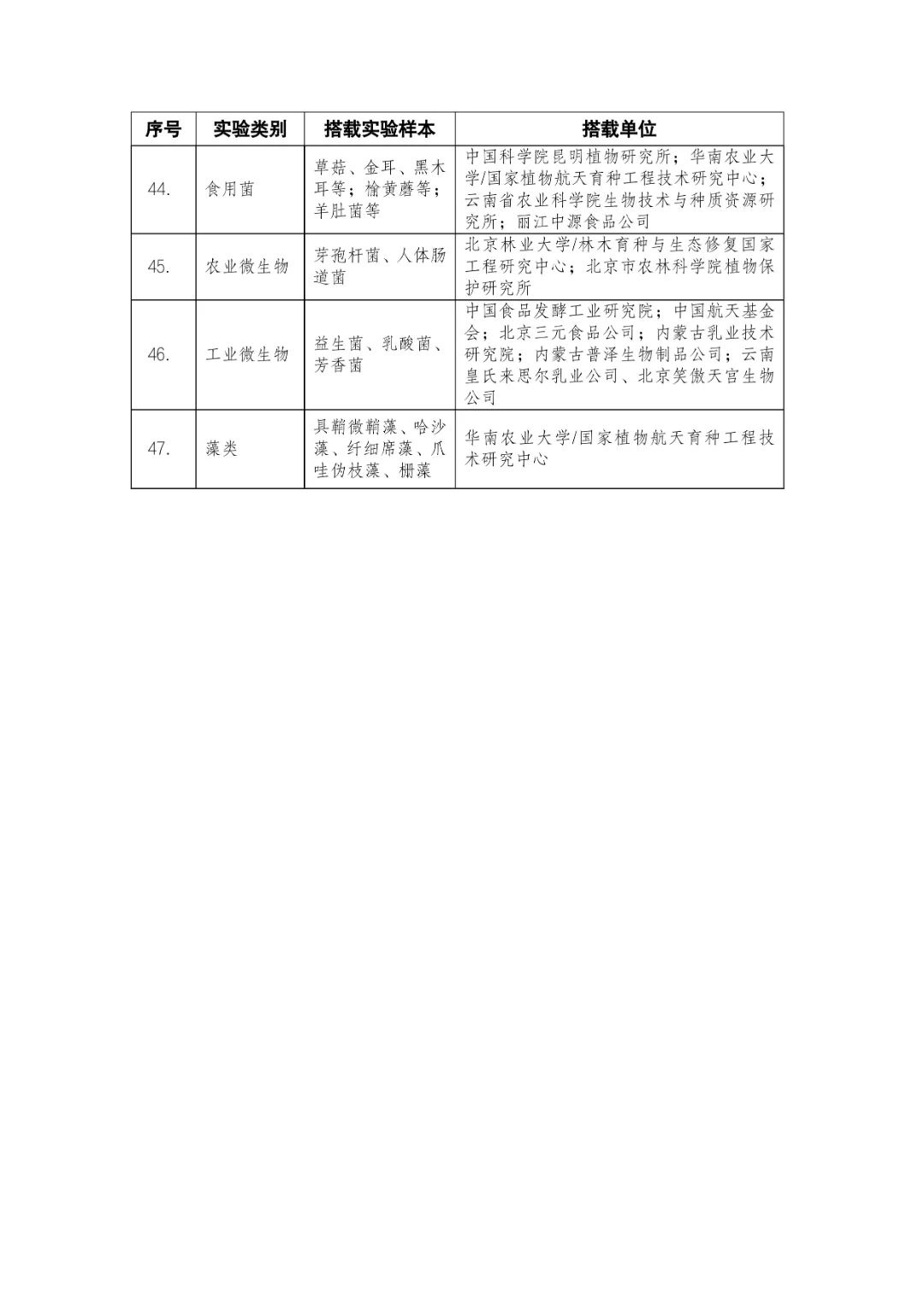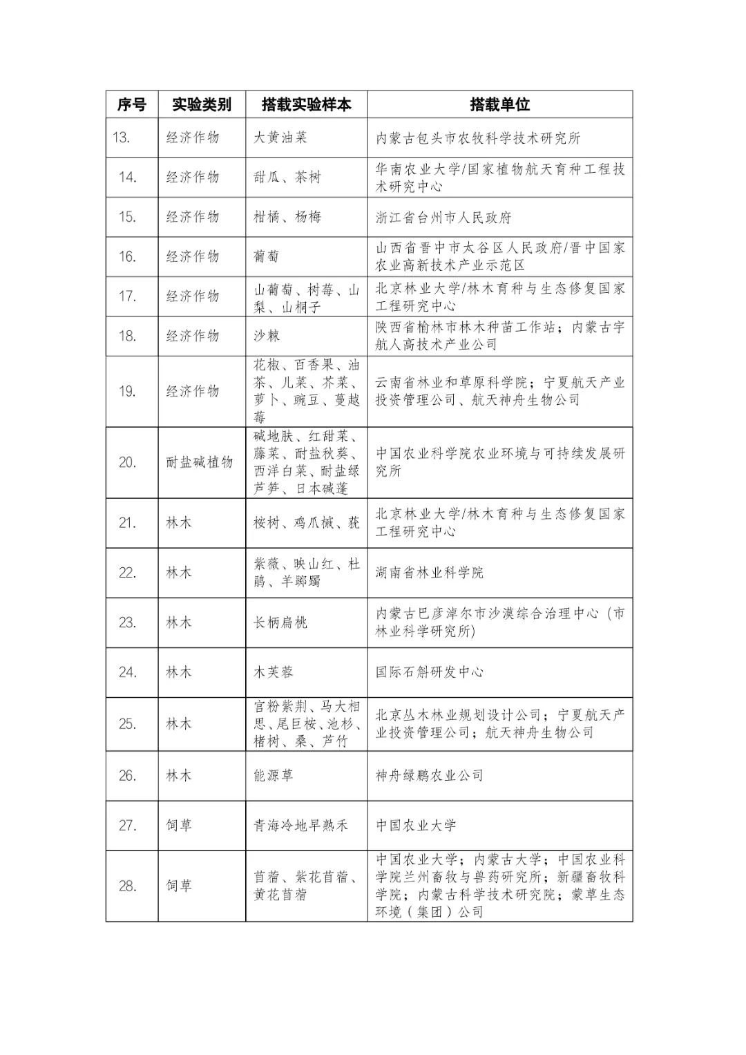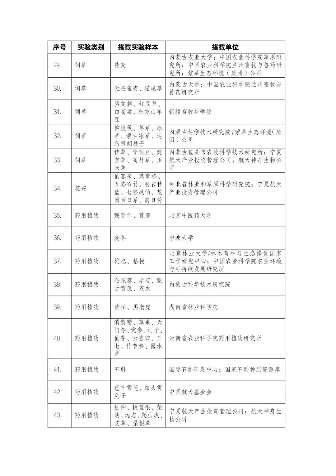 載人航天工程立項(xiàng)實(shí)施以來(lái),始終注重提升工程綜合效益,致力服務(wù)國(guó)家經(jīng)濟(jì)社會(huì)發(fā)展。在工程歷次飛行任務(wù)中,均安排了航天育種搭載實(shí)驗(yàn)項(xiàng)目。從神舟十六號(hào)載人飛船開(kāi)始,中國(guó)載人航天工程辦公室向社會(huì)公開(kāi)征集航天育種搭載實(shí)驗(yàn)項(xiàng)目,于3月23日在工程官網(wǎng)發(fā)布《關(guān)于征集神舟系列載人飛船航天育種實(shí)驗(yàn)項(xiàng)目的機(jī)會(huì)公告》,同時(shí)在工程官網(wǎng)開(kāi)辟“航天育種搭載實(shí)驗(yàn)”管理平臺(tái),接受搭載需求單位申報(bào)實(shí)驗(yàn)項(xiàng)目。辦公室組織專(zhuān)家對(duì)申報(bào)項(xiàng)目進(jìn)行評(píng)審,遴選出53個(gè)單位的136種份航天育種實(shí)驗(yàn)材料實(shí)施搭載。包括農(nóng)作物47份(糧食作物種子12份、經(jīng)濟(jì)作物種子28份、耐鹽堿植物7份);林草、花卉和藥用植物76份(林木17份、飼草21份、花卉7份、藥用植物31份);微生物和其它13種(農(nóng)業(yè)微生物菌種2種、工業(yè)微生物菌種3種、食用菌3種、藻類(lèi)和苔蘚5種)(清單附后)。