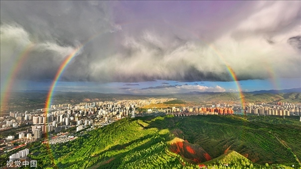 青海省西寧市一場云雨過后,天空出現(xiàn)雙彩虹。