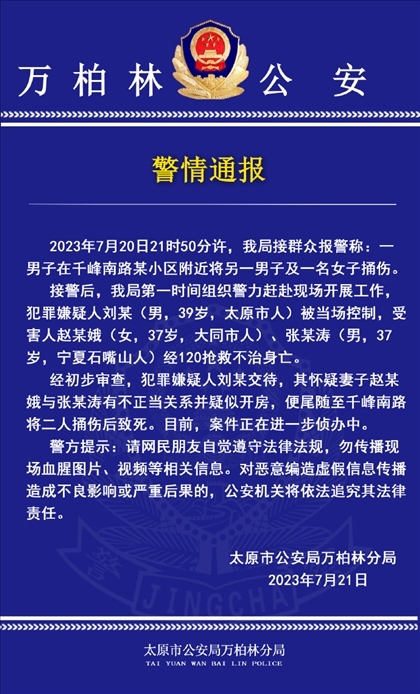 ·太原一男子懷疑妻子與他人有不正當(dāng)關(guān)系,將二人捅傷致死,已被警方當(dāng)場控制。