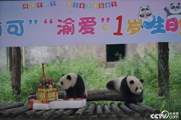 重慶:大熊貓“渝可”“渝愛”迎一周歲生日。
