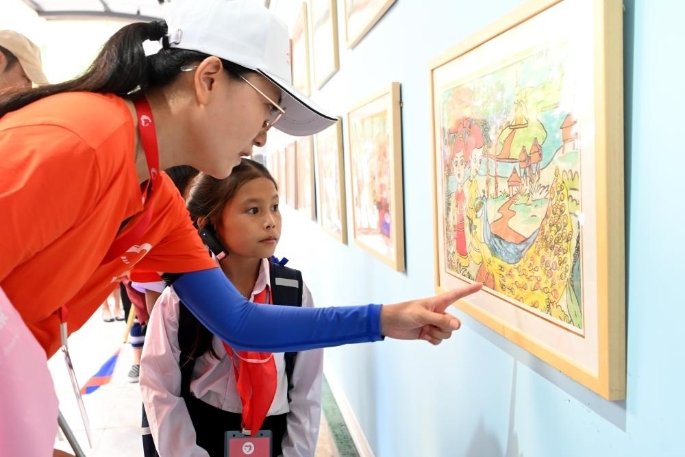 △2023年5月24日,乘坐中老鐵路國際旅客列車的百名老撾學(xué)生抵達(dá)中國云南西雙版納,和中國學(xué)生開展聯(lián)誼活動(dòng)。圖為志愿者向老撾學(xué)生講解允景洪小學(xué)內(nèi)展出的學(xué)生畫作。