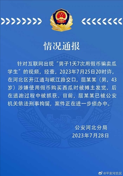 ·男子1天7次用假幣騙賣瓜學(xué)生?天津警方通報(bào)。