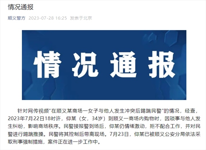 ·網(wǎng)傳“北京順義某商場一女子與他人發(fā)生沖突后踢踹民警”,警方通報(bào)。