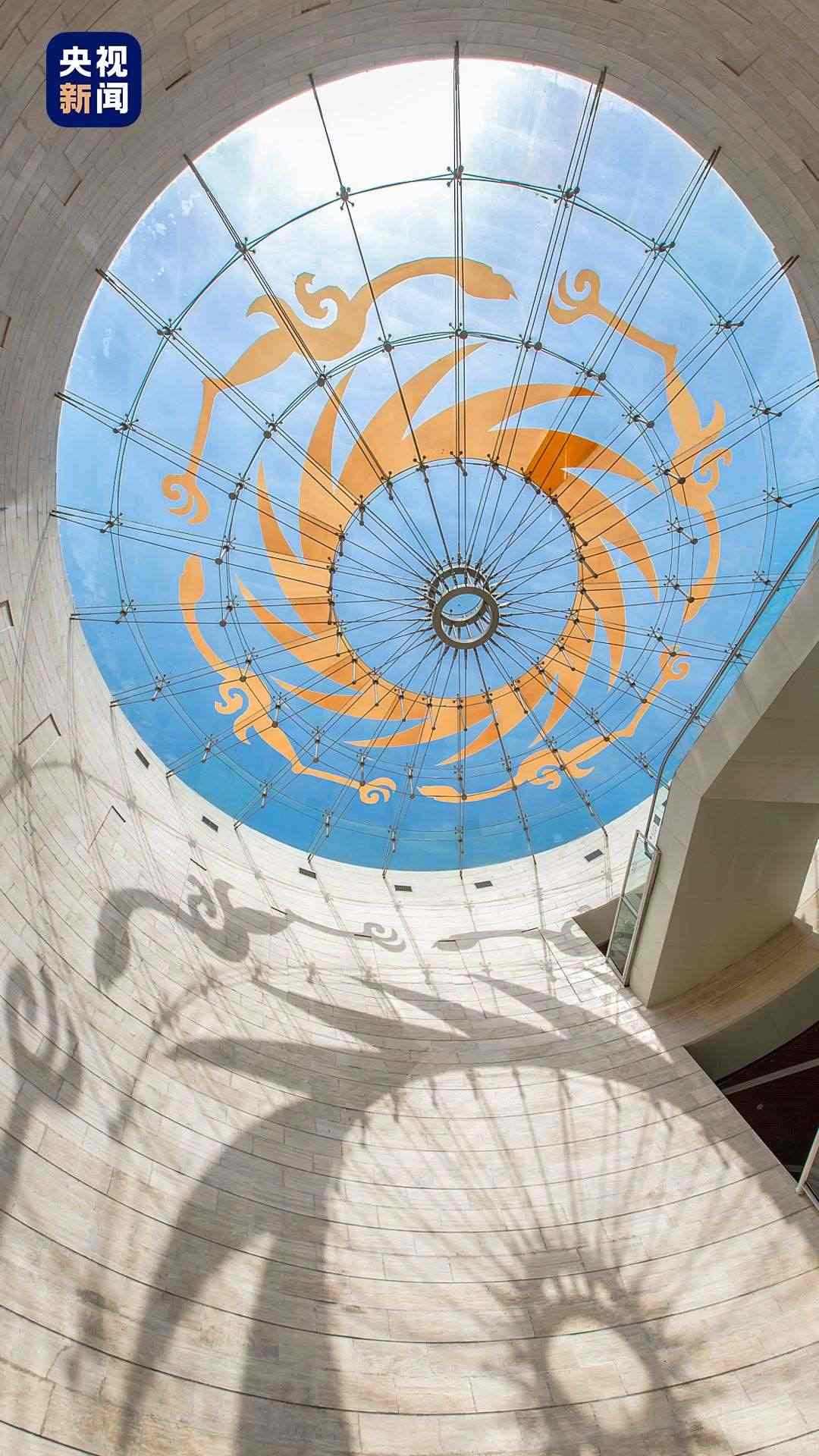 △綬帶正反面主色分別為藍(lán)色、紅色,融入芙蓉花、太陽(yáng)神鳥、棋盤格等元素,在自然光線下反射出不同的色彩。