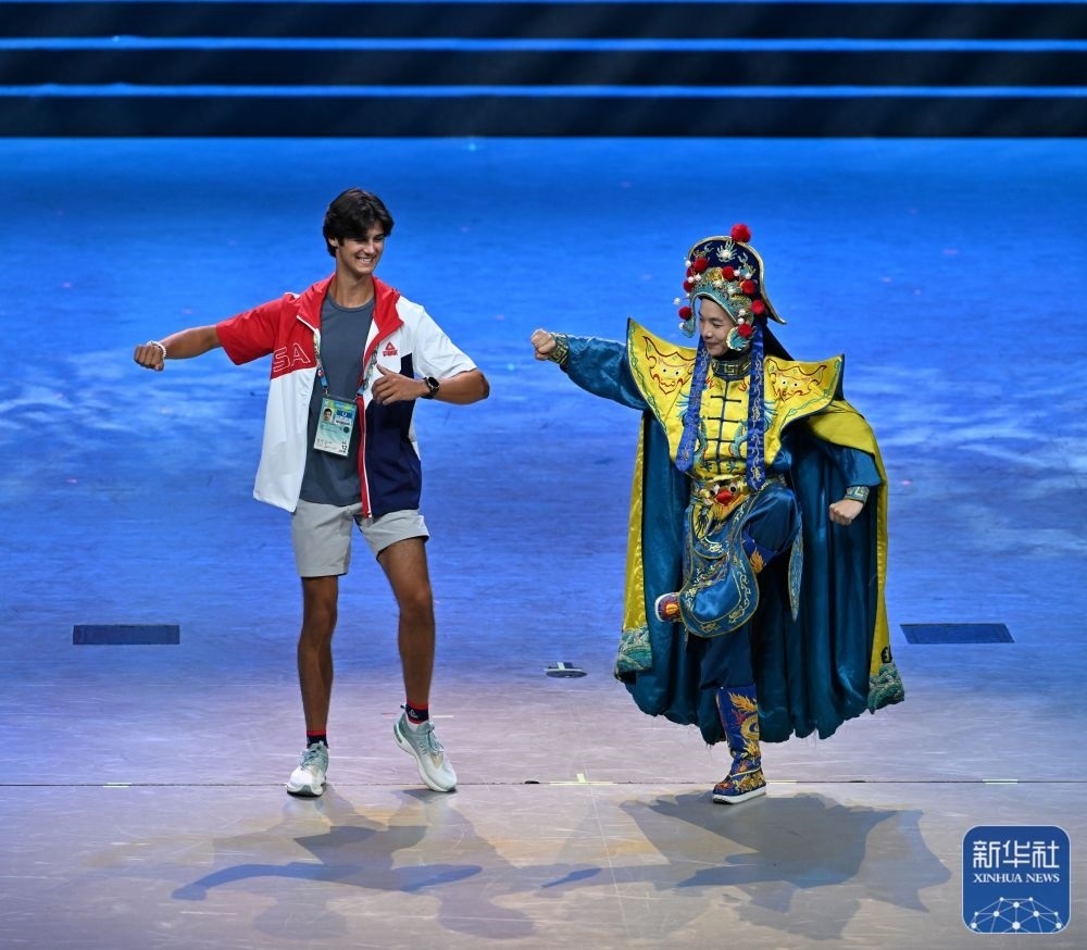 ↑7月29日,美國運動員杜恩(左)在聯(lián)歡會現(xiàn)場與川劇演員互動。新華社記者 蔡湘鑫 攝