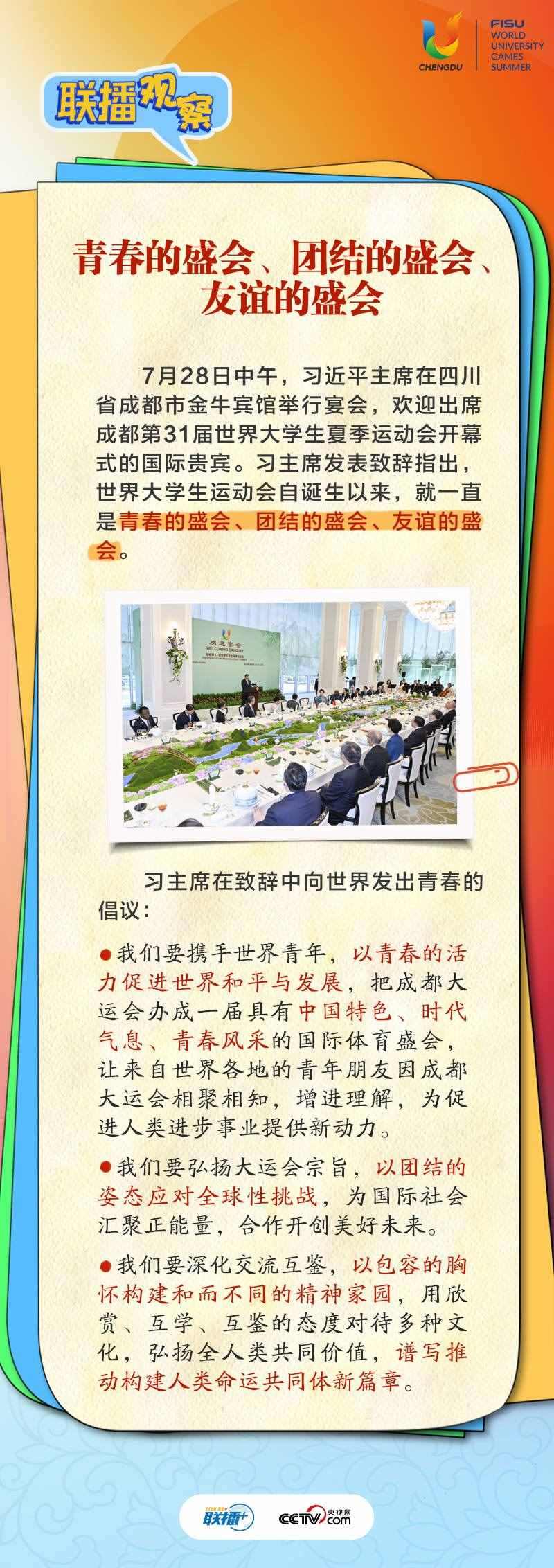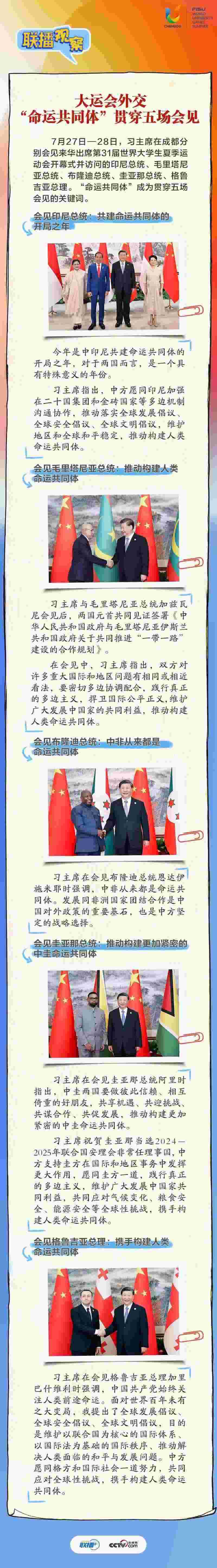 大運會時間,我國重要的主場外交也同步拉開帷幕,習(xí)近平主席的日程格外繁忙。央視網(wǎng)《聯(lián)播+》帶您沉浸式感受這場青春盛會為世界送出的別具匠心的“四川禮物”。
