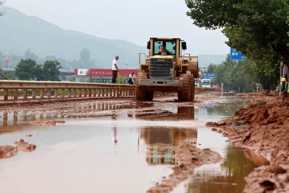 7月31日,在河北省石家莊市井陘縣307國道長崗村段,防汛工作人員駕駛機械清理淤泥。新華社發(fā)(梁子棟攝)
