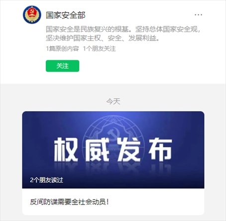 ·國(guó)家安全部官微亮相,發(fā)布首條推文《反間防諜需要全社會(huì)動(dòng)員!》。
