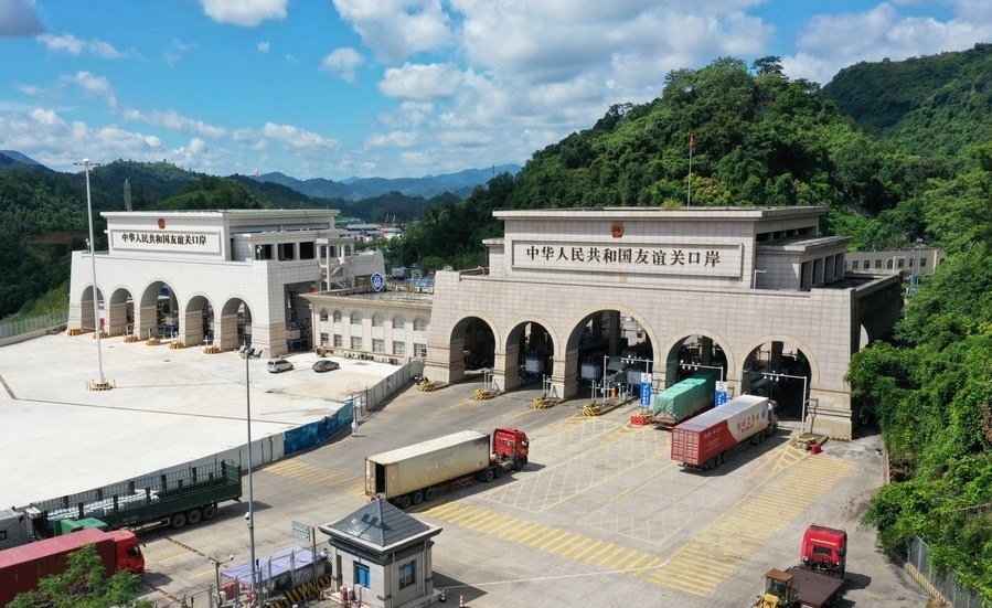 這是在廣西憑祥友誼關口岸通關的運輸車輛(無人機照片)。新華社記者 楊馳 攝