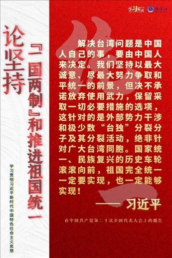 解決臺灣問題、實現祖國完全統(tǒng)一,是中國共產黨矢志不渝的歷史任務,是全體中華兒女的共同愿望,是實現中華民族偉大復興的必然要求。必須堅持貫徹新時代黨解決臺灣問題的總體方略,牢牢把握兩岸關系主導權和主動權,堅定不移推進祖國統(tǒng)一大業(yè)。