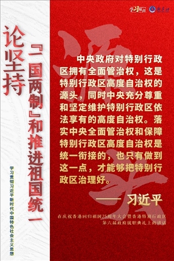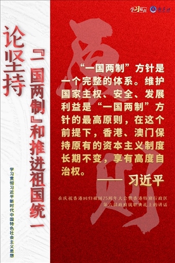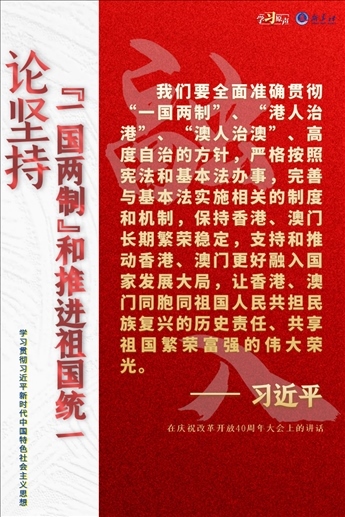“一國兩制”是黨領導人民實現祖國和平統(tǒng)一的一項重要制度,是國家的一項基本國策。中國特色社會主義進入了新時代,意味著“一國兩制”事業(yè)也進入了新時代。不斷推進“一國兩制”在香港、澳門的成功實踐,是中華民族偉大復興歷史進程的重要組成部分。