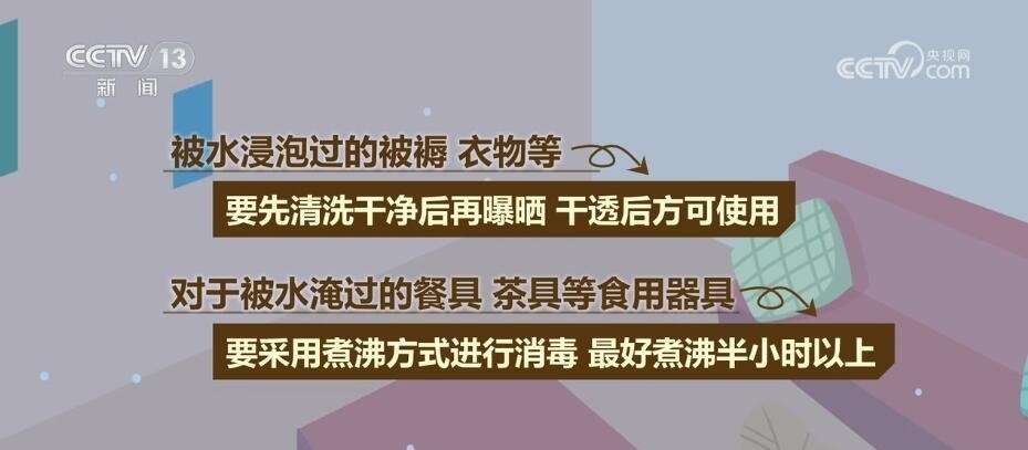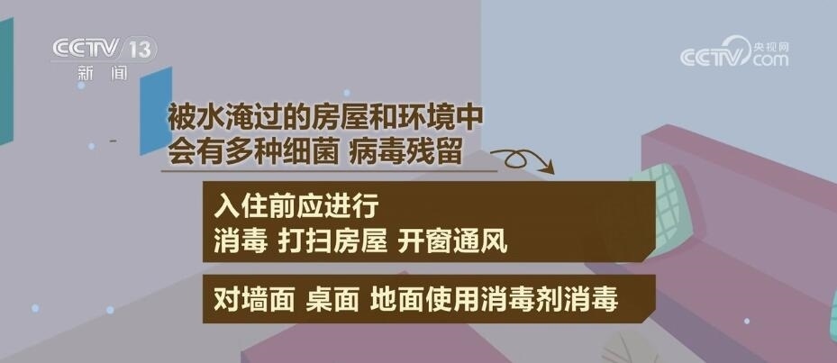 被水淹過的房屋和環(huán)境中會有多種細(xì)菌、病毒殘留,入住前應(yīng)進(jìn)行消毒,打掃房屋,開窗通風(fēng);對墻面、桌面、地面使用消毒劑消毒;被水浸泡過的被褥、衣物等,要先清洗干凈后再曝曬,干透后方可使用;對于被水淹過的餐具、茶具等食用器具,要采用煮沸方式進(jìn)行消毒,最好煮沸半小時(shí)以上。