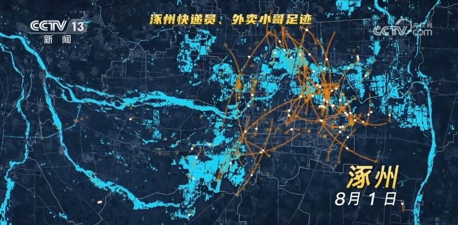 8月1日到8月2日,幾乎在24小時(shí)內(nèi),涿州小城就增加了近1.7萬(wàn)個(gè)外地手機(jī)信令,尤其有將近1萬(wàn)人從外省趕到涿州,我們從新聞中看到了來(lái)自各地的救援“逆行者”,爭(zhēng)分奪秒地向受災(zāi)最嚴(yán)重的地方挺進(jìn)。