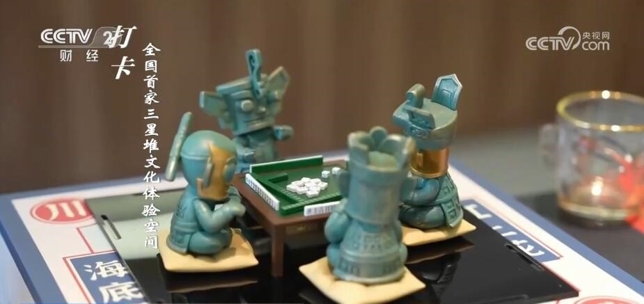 成都臺(tái)記者 劉然然:大家看我手中拿著的銅人,是按照三星堆博物館中的青銅人首鳥身像藏品復(fù)刻的。無論是造型還是材質(zhì),都盡量做到和館藏一致。這里是三星堆博物館官方授權(quán)的全國首家體驗(yàn)空間。