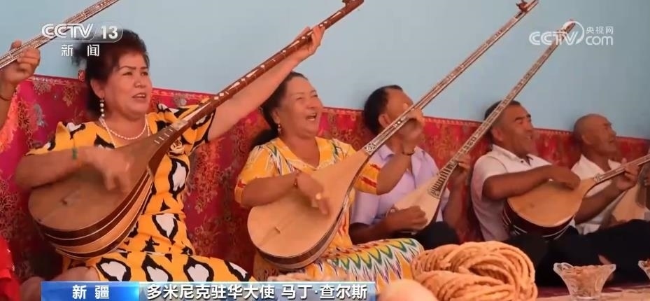 駐華使節(jié)們走進(jìn)喀什古城的街市巷陌,感受當(dāng)?shù)鬲?dú)特的民族文化;在克孜爾千佛洞,領(lǐng)略跨越千年的石窟藝術(shù);來到新疆民間手工樂器制作第一村庫車市新和縣加依村,同當(dāng)?shù)匕傩找黄疠d歌載舞;觀看非遺項目十二木卡姆等一系列活動,讓使節(jié)們感嘆,新疆少數(shù)民族傳統(tǒng)文化和生活習(xí)俗得到了充分保護(hù)。