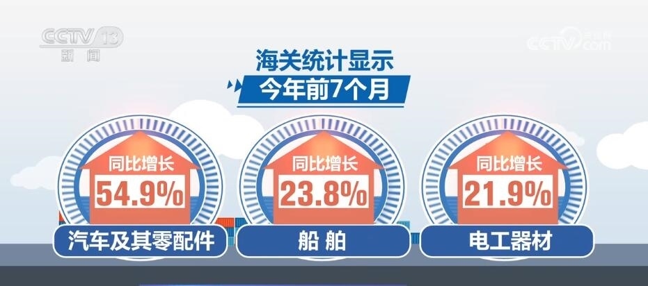 海關統(tǒng)計顯示,今年前7個月,我國機電產品出口占比提升,汽車及其零配件、船舶、電工器材同比分別增長54.9%、23.8%、21.9%。