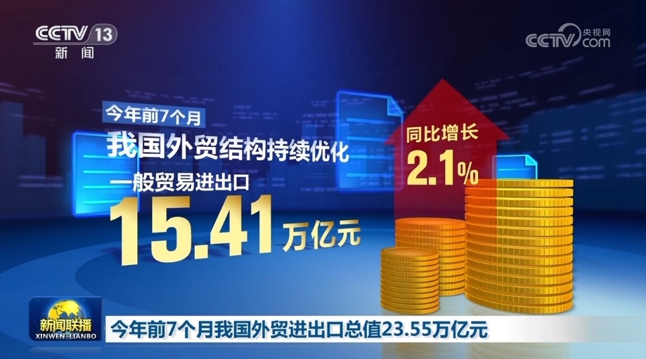 央視網(wǎng)消息(新聞聯(lián)播):海關(guān)總署今天(8月8日)對(duì)外公布,今年前7個(gè)月,我國(guó)貨物貿(mào)易進(jìn)出口總值23.55萬億元,外貿(mào)運(yùn)行平穩(wěn)、符合預(yù)期。