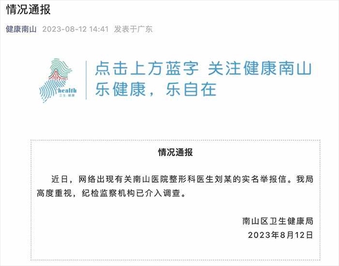 ·網(wǎng)傳南山醫(yī)院整形科醫(yī)生劉某被實(shí)名舉報(bào),官方通報(bào):紀(jì)檢監(jiān)察機(jī)構(gòu)已介入調(diào)查。