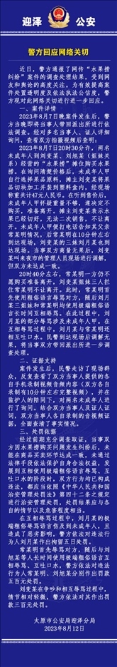·太原警方再通報(bào)“女生拒買水果撈被罵小三”:店方粗俗語(yǔ)言傷及未成年被拘留5日,家長(zhǎng)以及另外兩名店方人員互相辱罵等被罰款。
