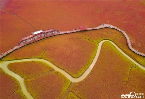 2023年8月11日,遼寧盤錦,紅海灘堿蓬草迎來最佳觀賞期。