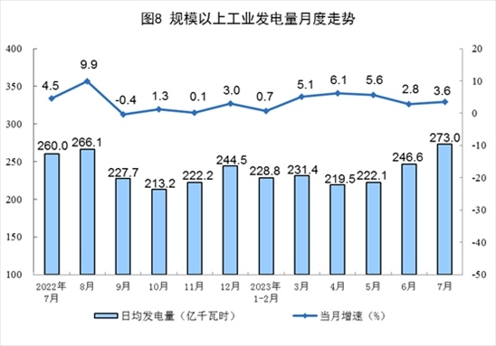 電力生產(chǎn)有所加快。7月份,發(fā)電量8462億千瓦時(shí),同比增長3.6%,增速比6月份加快0.8個百分點(diǎn),日均發(fā)電273.0億千瓦時(shí)。1—7月份,發(fā)電量50130億千瓦時(shí),同比增長3.8%。