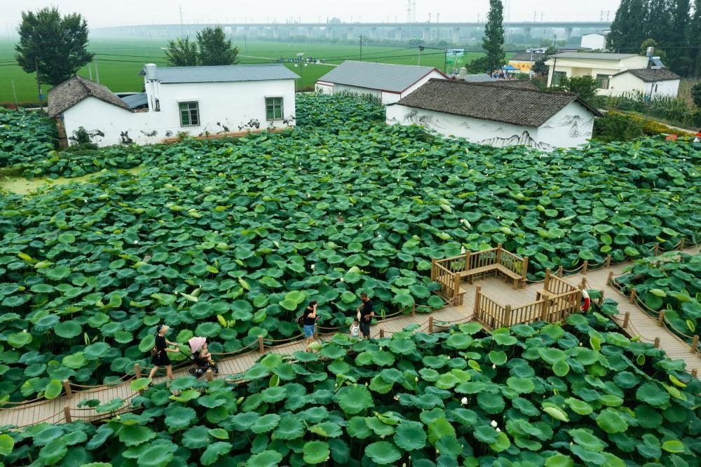 △2022年6月22日,人們在四川眉山市東坡區(qū)太和鎮(zhèn)永豐村欣賞荷塘美景。