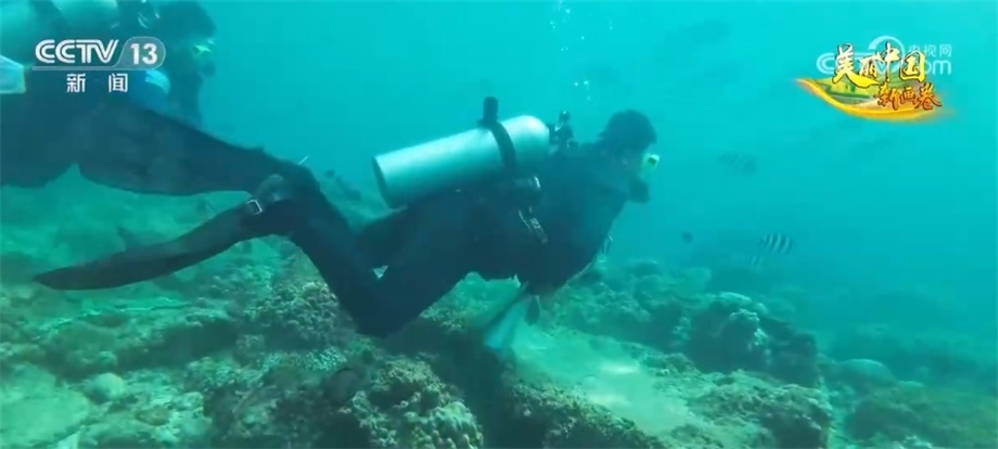 總臺央視記者 焦健:我現(xiàn)在位于海南三亞蜈支洲島,在我身旁的這片海域就是我國的第一個熱帶海洋牧場。這段時間,海洋牧場正在進(jìn)行珊瑚移植和調(diào)裝魚礁的工作。我們帶著水下攝像機,跟隨著工作人員一起進(jìn)入海底,體驗在海里如何“植樹造林”。