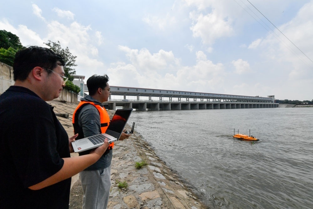 8月2日,在天津市獨(dú)流減河進(jìn)洪閘上游,水文人員操作無人水文監(jiān)測船進(jìn)行水文監(jiān)測。新華每日電訊記者孫凡越攝