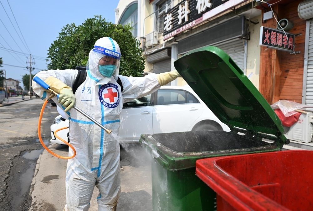 8月17日,工作人員在天津市靜海區(qū)臺頭鎮(zhèn)進(jìn)行消殺作業(yè)。新華每日電訊記者趙子碩攝