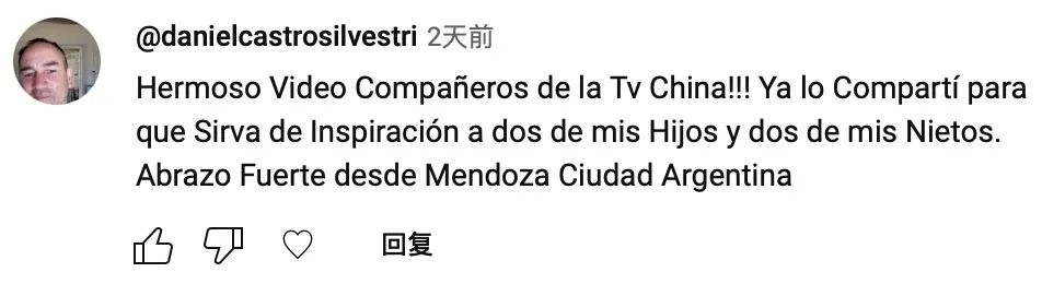 網(wǎng)友danielcastrosilvestri:“中國(guó)電視臺(tái)的朋友們,這個(gè)視頻太好看了?。?!我把它分享出去,希望它能夠給我的兩個(gè)孩子和兩個(gè)孫子帶來(lái)啟發(fā)。我來(lái)自阿根廷的門(mén)多薩市,致禮。”