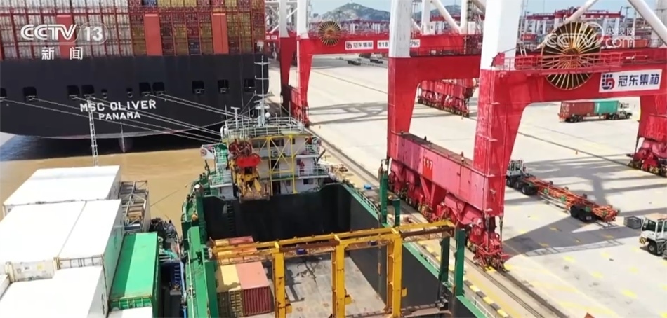 在洋山港三期冠東碼頭,兩艘大型遠洋集裝箱船中間的這艘小船是來自江蘇太倉港的快航班輪,它剛剛完成200多個集裝箱裝卸。通過水路完成“水水中轉(zhuǎn)”,將這些集裝箱裝上遠洋貨輪出口海外,無需轉(zhuǎn)關(guān)申報或倉儲停留,實現(xiàn)了聯(lián)動接卸。
