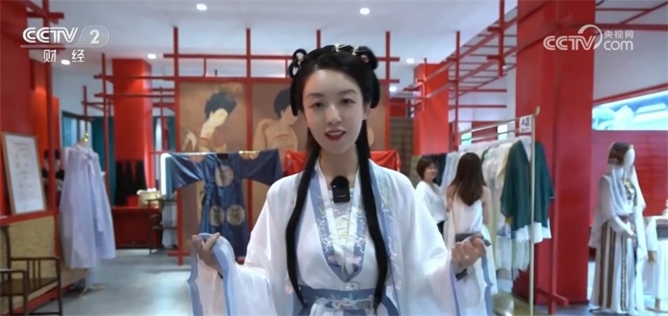 總臺央視記者 劉藝涵:沉浸式古鎮(zhèn)之旅一定少不了換裝體驗,也是不少游客來到這里首選的項目。目前,園區(qū)內(nèi)像這樣的古裝店共有7家,提供租賃、銷售、化妝造型和攝影等服務(wù)?,F(xiàn)在我身上的這件就是店里的一款經(jīng)典的漢服,全天的租賃價格是199元。