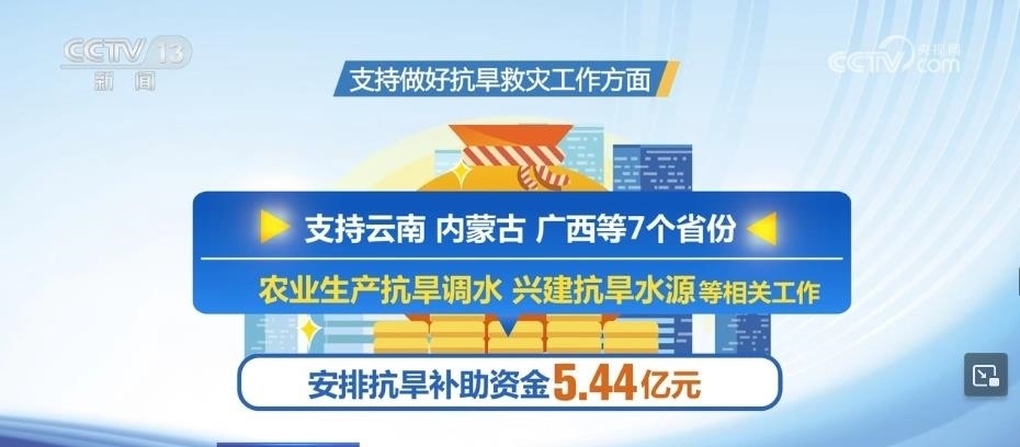 在支持做好抗旱救災(zāi)工作方面,安排抗旱補(bǔ)助資金5.44億元,支持云南、內(nèi)蒙古、廣西等7個省份,開展農(nóng)業(yè)生產(chǎn)抗旱調(diào)水、興建抗旱水源等相關(guān)工作。 ?