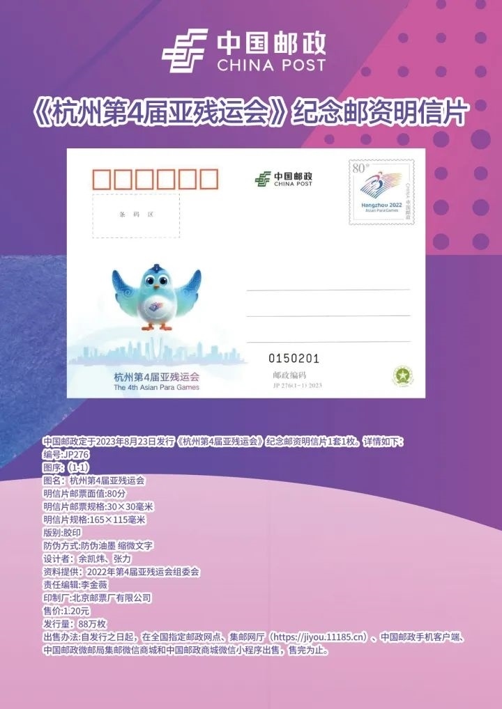 今天,中國郵政還發(fā)行了《杭州第4屆亞殘運會》紀念郵資明信片一套1枚,編號為JP276。郵資圖為杭州亞殘運會會徽,主體表現(xiàn)杭州亞殘運會名稱和吉祥物飛飛,襯以杭州城市剪影,體現(xiàn)“兩個亞運,同樣精彩”的辦賽理念,激勵殘疾人運動員在競技舞臺上,展現(xiàn)勇于挑戰(zhàn)、戰(zhàn)勝自我、創(chuàng)造幸福的良好精神風貌。