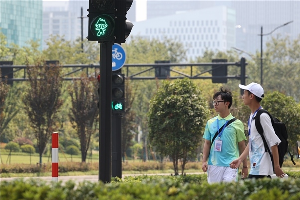 2023年8月25日,杭州亞運村內(nèi),亞運吉祥物版的交通信號燈出現(xiàn)在路口。