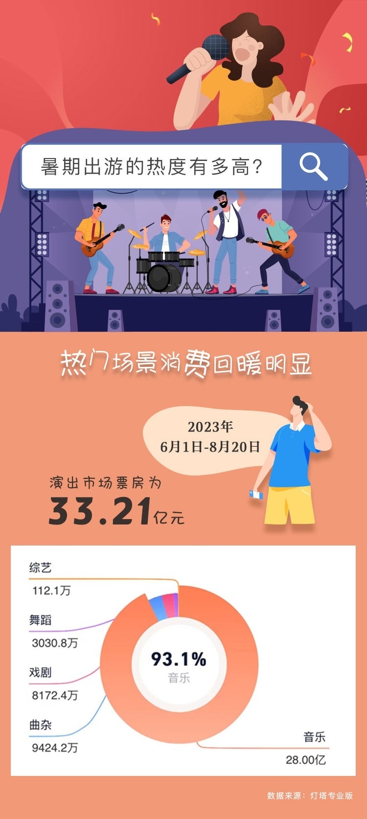 作為演出市場(chǎng)的傳統(tǒng)旺季,暑假期間演唱會(huì)、Live house、戲劇、音樂(lè)劇等各類熱門演出“一票難求”。根據(jù)燈塔專業(yè)版最新數(shù)據(jù),暑期檔中的6月1日至8月23日演出市場(chǎng)票房已經(jīng)超過(guò)30億元,而相當(dāng)可觀的跨城觀演比例,更引得除了演出票房之外的周邊產(chǎn)業(yè)一起火?!耙粋€(gè)演出圈粉一座城”,當(dāng)?shù)芈糜谓?jīng)濟(jì)不斷涌現(xiàn)新的可能。