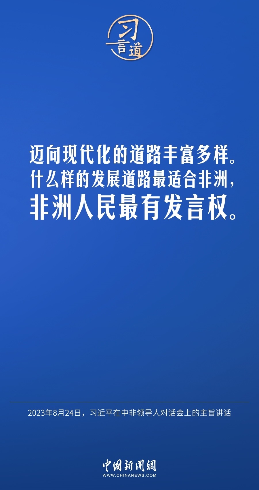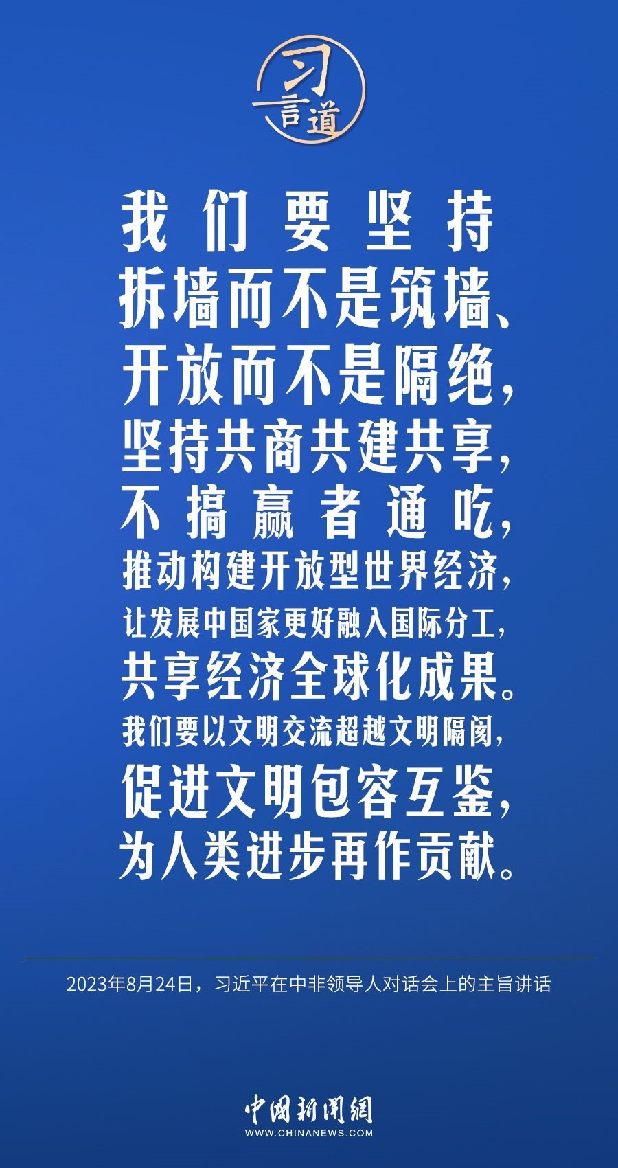 當?shù)貢r間8月24日晚,國家主席習(xí)近平和南非總統(tǒng)拉馬福薩在約翰內(nèi)斯堡共同主持中非領(lǐng)導(dǎo)人對話會。習(xí)近平發(fā)表題為《攜手推進現(xiàn)代化事業(yè) 共創(chuàng)中非美好未來》的主旨講話。習(xí)近平指出——